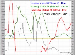 Case History: An MFA flare control system has been running in a petrochemical plant in Texas for 2 years. Due to its robust control performance in varying operating conditions, the customer is able to lower the heating value setpoint from 400 to 350 Btu/scf to reduce natural gas consumption and still meet the EPA’s 300 Btu/scf low limit. The control system achieved substantial economic benefits for the customer.