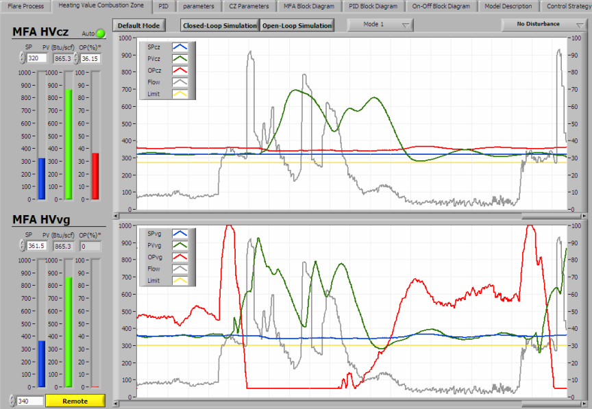 MFA Flare Control with Assist Steam: (1) The MFA Vent Gas Heating Value Control System controls the NHVvg and can deal with large vent gas flow disturbances and Btu changes caused by nitrogen purge; (2) The MFA Steam Control System controls the steam flow based on the total amount of vent gas and its contained heating value; and (3) The MFA Combustion Zone Heating Value Control System uses an Anti-delay MFA controller to deal with large and varying time delays.