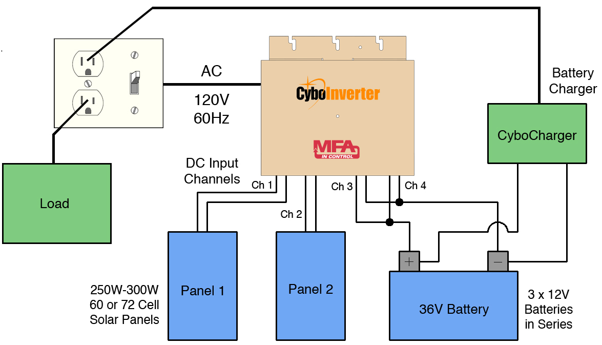 A CyboInverter has 4 input channels, where Channel 1 and 2 can connect to 2 solar panels and Channel 3 and 4 can connect to a 36V battery set. Its AC output can power lights, fans, TV, PC, battery chargers, and refrigerators. A CyboCharger takes power from the same off-grid AC circuit as a load and charges the 36V battery during the day.