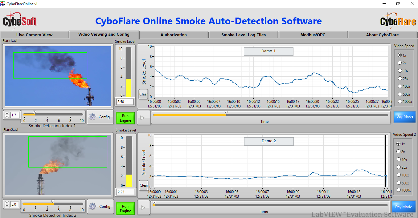 CyboFlare has an online mode that can connect to one or multiple video cameras over a communication network so that live flare videos can be viewed and analyzed by a smoke auto-detection engine in real-time. The smoke conditions are reported using Smoke Level, a value in the range of 0 to 10, where 0 means no smoke and 10 indicates that the flare has the highest smoking condition. The Smoke Level can be sent in real-time to the plant DCS to trigger an alarm, and control override actions can be taken automatically by the DCS to take the flare out of smoke quickly. CyboFlare also has a historical mode where the saved Smoke Level data can be reviewed for smoke condition tracking, reporting, and EPA auditing.