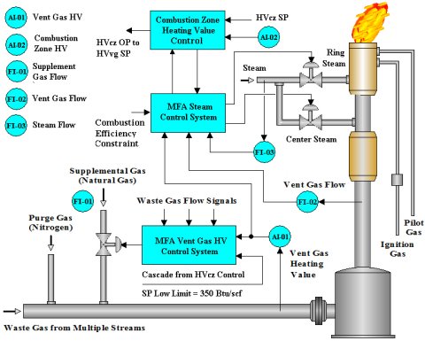 As an example, the following diagram shows CyboSoft’s design of controlling a steam assisted flare: (1) An MFA Vent Gas Heating Value Control System controls the NHVvg and can deal with large vent gas flow disturbances and Btu changes caused by nitrogen purge; (2) The MFA Steam Control System controls the steam flow based on the total amount of vent gas and its contained heating value; and (3) The MFA Combustion Zone Heating Value Control System uses an Anti-delay MFA controller to deal with large and varying time delays.