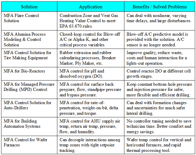 Dr. Cheng added in his Authors Comments of this new edition, “CyboSoft has made significant effort to develop and package complete MFA control solutions for a specific industrial process or equipment where there can be multiple control and measurement challenges. These are typically industry-wide problems that cannot be solved using traditional control methods. In this edition, MFA Control Solutions are added in Section 1.6, each of which will have a specific user guide as a supplemental document. Many of these solutions have been installed in large scale and are available for new customers to acquire and deploy.” The following table shows eight MFA Control Solutions in different industries. |