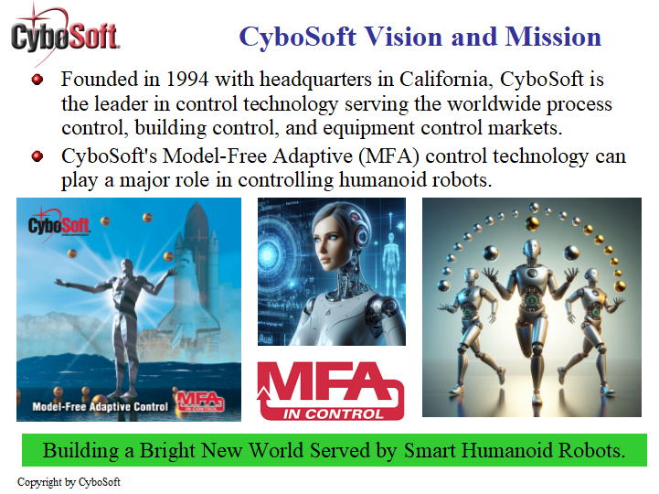 May 7, 2024 – CyboSoft (Rancho Cordova, California), the developer of Model-Free Adaptive (MFA) control technology and products, announced today that it has released a short video to demonstrate high-speed MFA motion control systems and the ability to control Humanoid Robots.