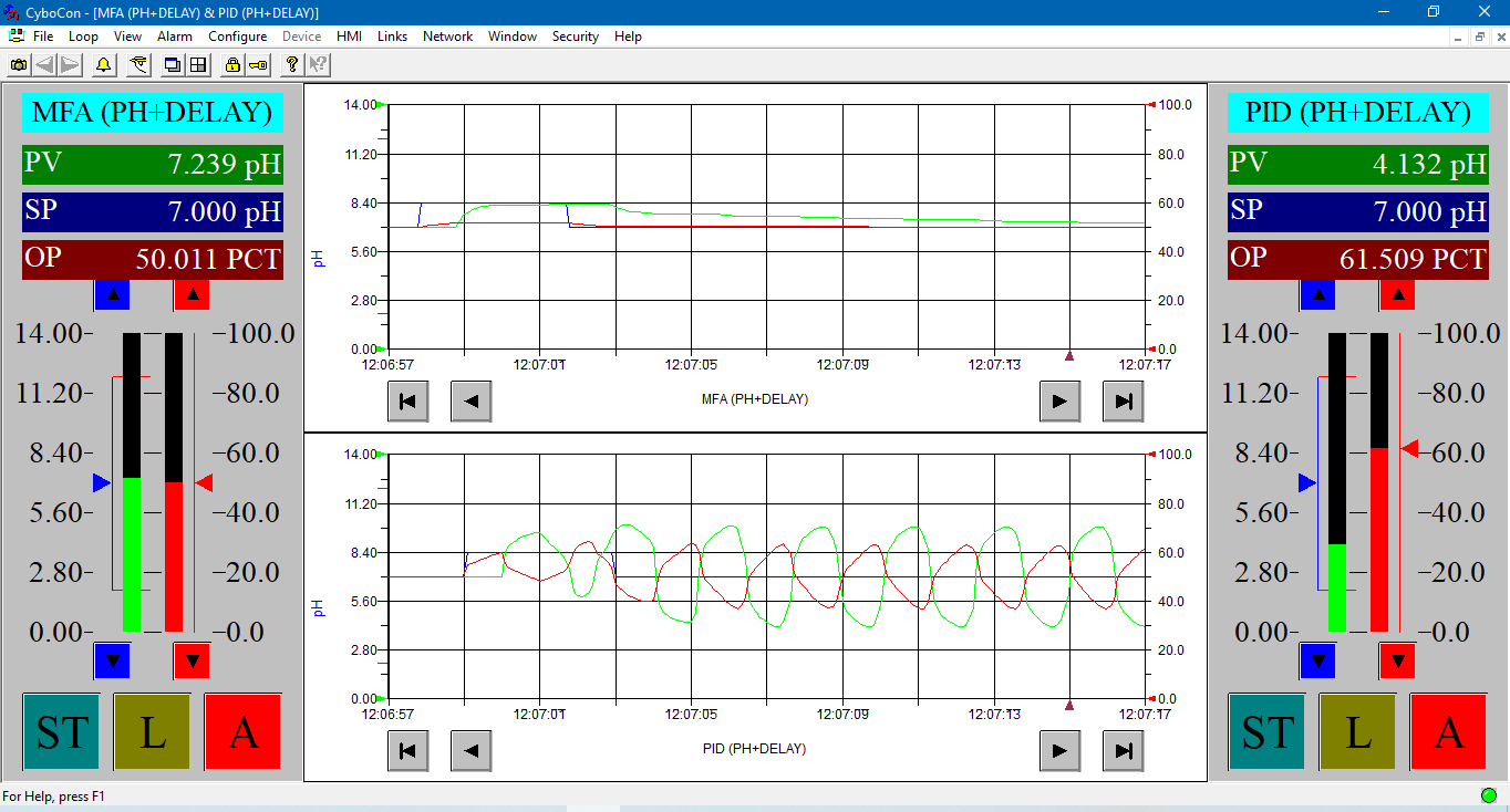 The Design Guide includes the following: (1) Mega trend - critical threats to our world, (2) pH control challenges, (3) Review of control methods, (4) Introduction of Model-Free Adaptive (MFA) control, (5) MFA controllers and applications, (6) MFA pH controller and case study, (7) Anti-delay MFA pH controller and case study, (8) MFA control products and system implementation, (9) MFA methodology, and (10) CyboSoft offerings and value proposition. The following graphic shows a CyboCon MFA control software demo, where an Anti-delay MFA pH controller (top trend) can effectively control a pH process with large time delays, while a PID (lower trend) will cause the pH loop to oscillate since it cannot deal with the pH nonlinear behavior and large time delays.